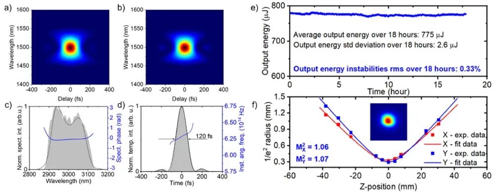 Figure 2: (a, b) Measured and reconstructed frequency-resolved optical gating (FROG) traces, (c) spectrum, (d) pulse width, (e) power stability, and (f) beam quality M2 factor of the 3 μm mid-infrared light[1]