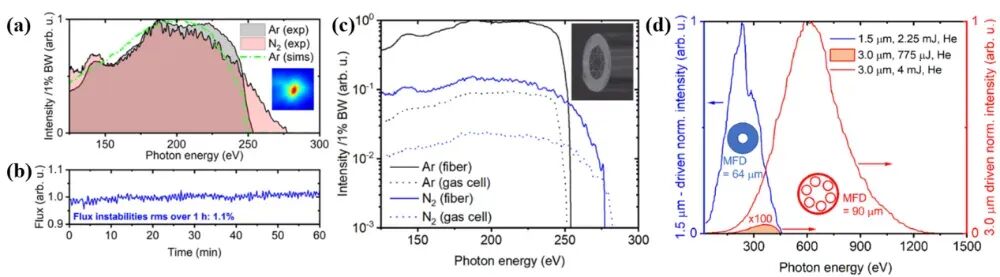As depicted in Figure 3(a), the HHG spectra generated in both Ar and N2 extend to the cutoff energy region, with the experimental spectrum of Ar closely matching the simulation (Figure 3(a), green dashed line). The harmonic intensity stability over 1 hour has an RMS of 1.1% (Figure 3(b)), which is comparable to the typical stability of extreme ultraviolet high-order harmonics. This study compares the harmonic intensities generated in a 1.75 mm long gas target with those generated in an ARHCF. In the ARHCF, Ar produces a maximum photon flux of 105/s/1%BW, with a conversion efficiency from mid-infrared to >125 eV photons of 4e-10. Due to shorter interaction distances and lower pressures, the gas cell generates harmonic intensities an order of magnitude lower than the ARHCF. Owing to molecular alignment effects, N2 produces harmonic intensities approximately five times lower than Ar. This study also simulates HHG driven in He, which exhibits lower absorption. When combined with higher pulse energy and shorter pulse widths, the photon flux is expected to increase by 10,000 times (Figure 3(d)).