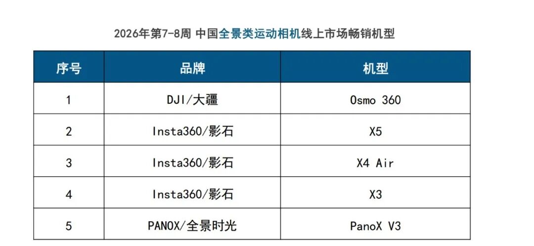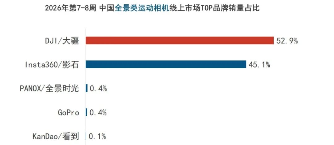 According to Jiutian Zhongtai data, DJI surged from zero to a 43% global share in Q3 2025, while Insta360's share plummeted to 49%. Luotu Technology's 2026 Spring Festival weekly tracking showed DJI dominating with a 62.9% total sales share, compared to Insta360's 28.6%. In the 360-degree camera segment, a single DJI model captured 52.9% of the market, while Insta360's three models combined accounted for 45.1%.