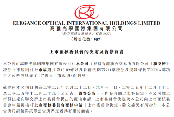 As of 9:00 a.m. on April 23, Elegance Optical, a company with a 30-year history on the stock market, was officially suspended from trading by the Stock Exchange. The Listing Review Committee maintained its prior decision, citing the company's failure to sustain sufficient operational capacity and assets of adequate value to underpin its business operations.