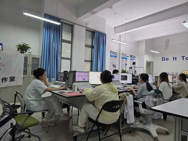 In mid-July 2025, the summer vacation at Zhengzhou University of Light Industry had already begun, and the campus was sparsely populated. We visited Meiker Studio on the second floor of the Comprehensive Building, where several long tables were put together, and dozens of students were still sitting in front of computers.