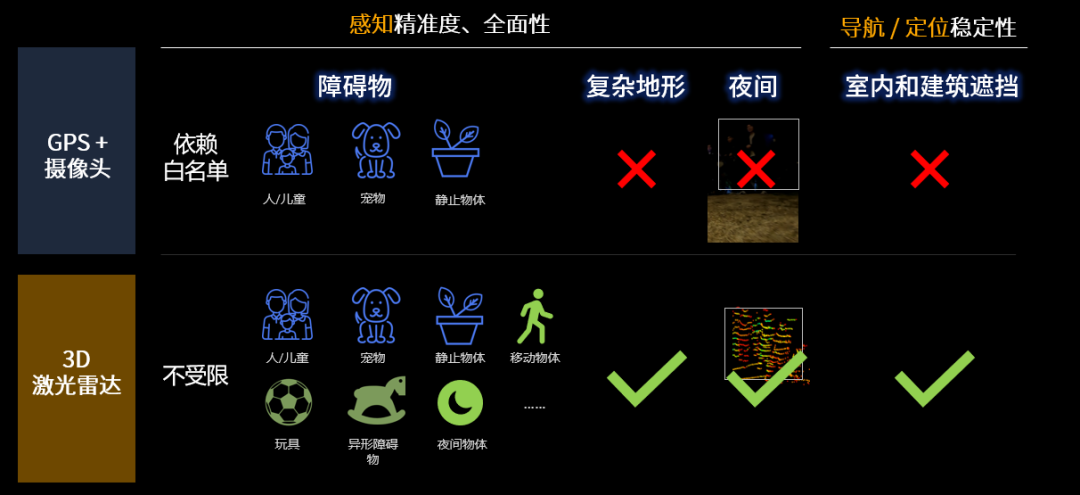 LiDAR, especially 3D LiDAR, surpasses traditional solutions in terms of perception accuracy, comprehensiveness, and navigation/positioning stability.