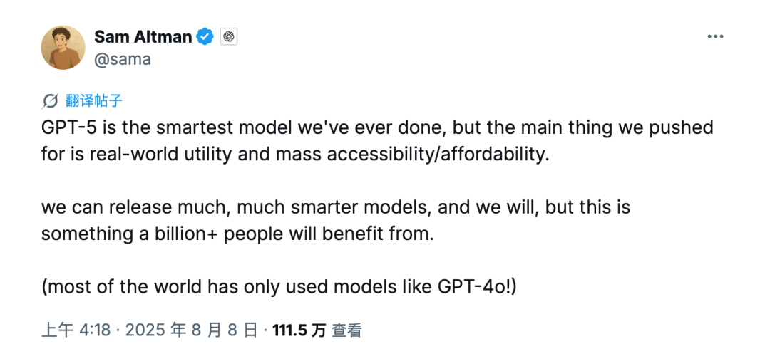 After the release of GPT-5, Sam Altman emphasized that GPT-5 is the smartest model they have developed so far, but their core pursuit is practicality in the real world, large-scale accessibility/affordability.
