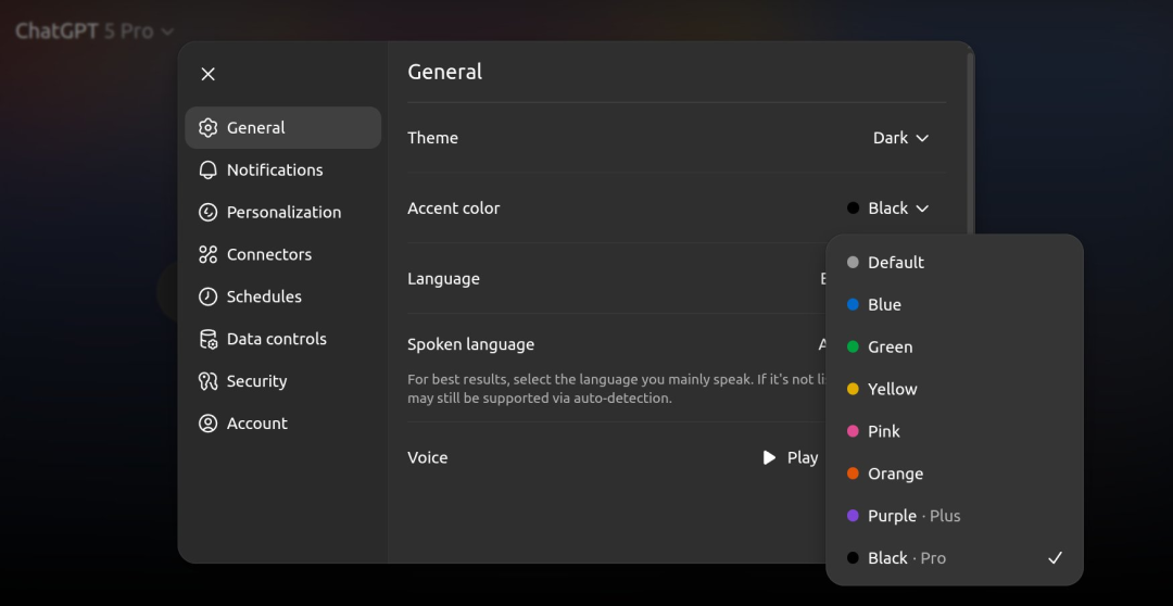 GPT-5 is now open to all users. When opening ChatGPT, a more noticeable perception is that the conversation interface has become more colorful, and users can now customize the color of the conversation bubbles - but purple is limited to Plus users, and Pro users can use the more prestigious black. OpenAI, which has always distinguished user levels based on model capabilities, has finally learned the essence of QQ membership.