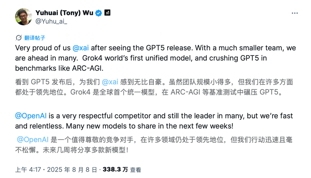 Wu Yuhuai, co-founder of xAI, also expressed on X that the xAI team felt very proud after the release of GPT-5. "Despite being much smaller in team size, we are leading in many aspects." He said that xAI will release more new models in the coming weeks.