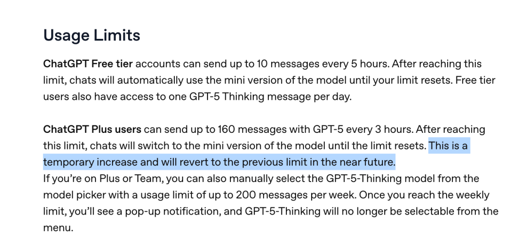 Sam had to post two consecutive tweets to reassure users, promising to more clearly show users which model is answering questions, make it easier to switch to deep thinking, and double the usage quota for Plus users to 160 entries – but OpenAI stated on its official website that this was only a temporary quota increase and would revert to the original limit soon.