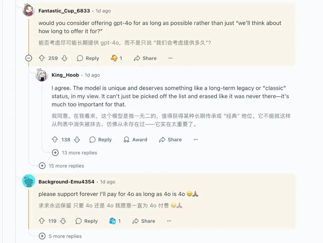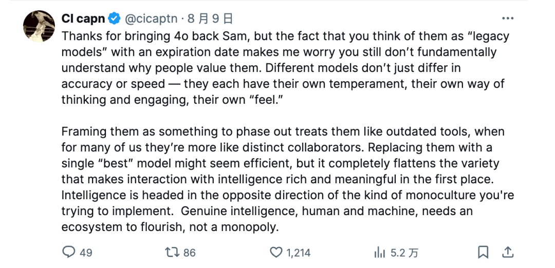 "You don't fundamentally understand why people cherish them," commented a ChatGPT user under Sam's post. "Different models not only differ in accuracy and speed but also have their unique personalities, ways of thinking, and interactions, as well as distinct 'feelings.' Treating them as something to be phased out is essentially treating them as outdated tools, whereas for many of us, they are more like unique partners."