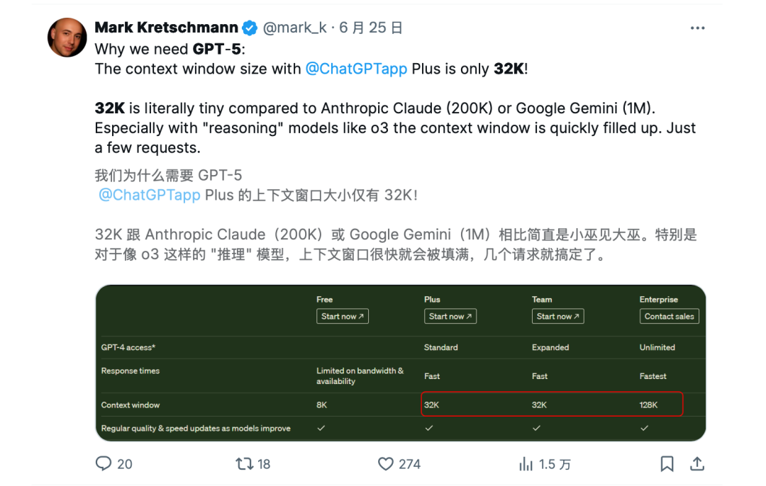 OpenAI subsequently stated that they would develop a thinking mode for GPT-5 mini to achieve the same overall reasoning quota. For Plus users, the maximum context length supported by GPT-5 is only 32k, which has also sparked numerous complaints, as Gemini and Claude support longer context lengths at the same price.