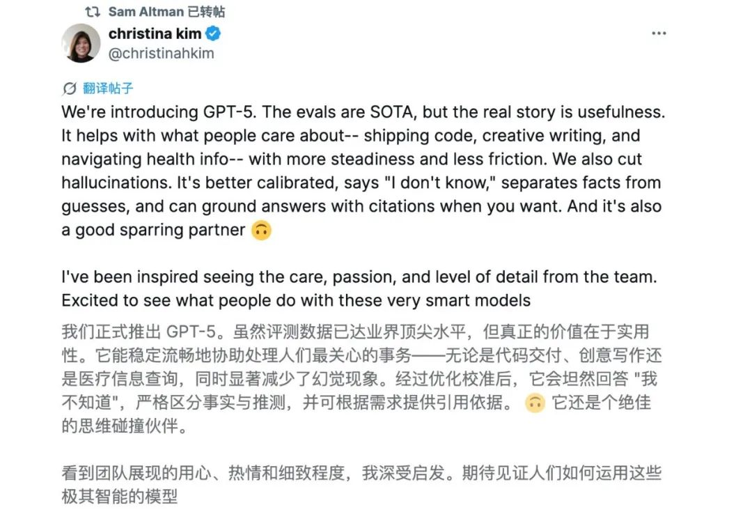 In short, these updates are all about enhancing the reliability and ease of use of the model, allowing users to more confidently introduce AI into their workflows. Christina Kim, a researcher at OpenAI, said on X that although GPT-5's performance reaches the top level in the industry, its true value lies in practicality. "It is better calibrated, says 'I don't know,' can distinguish between facts and guesses, and can provide citation sources to support answers when you need them."
