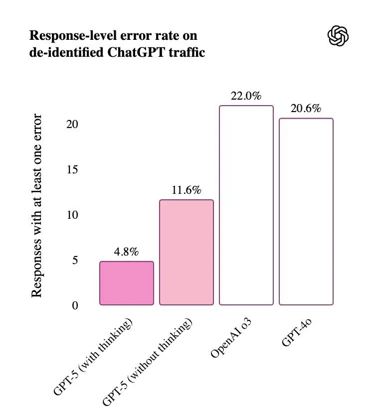 For example, with web search enabled, the probability of factual errors in GPT-5 is nearly half that of GPT-4o. In deep thinking mode, GPT-5's factual error rate is about 80% lower than o3. GPT-5 will also be "more honest" with users. It can more accurately identify tasks that cannot be completed and honestly express its limitations.