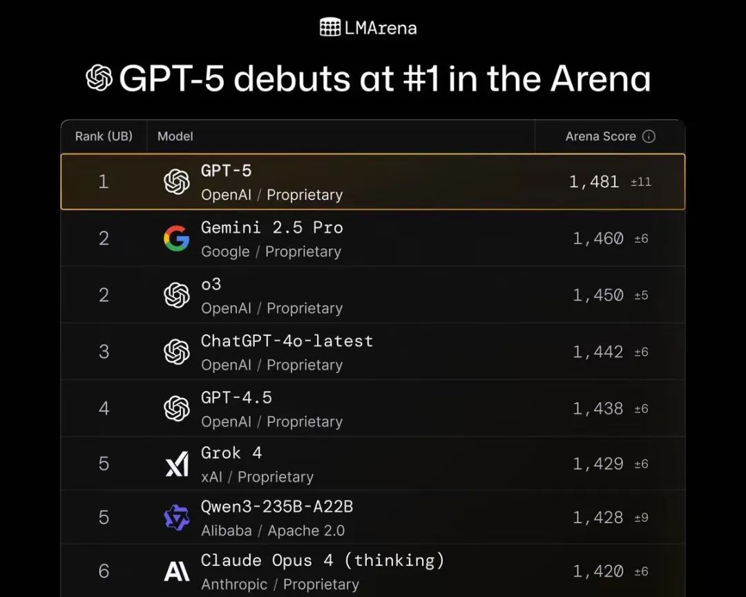 In the latest "Arena" rankings on the neutral evaluation platform LMArena, GPT-5 still ranks first in all evaluation items, including text understanding, programming, vision, and other categories. "GPT-5 tops the LMArena rankings with the highest score ever," LMArena described.