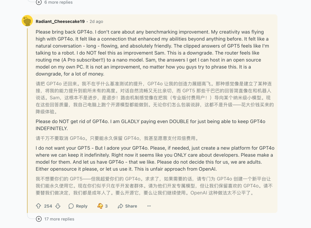 These are still engineering optimizations that can be resolved through iterative improvements over time. Another unexpected issue for OpenAI may be some users' emotional attachment to older models. Even though GPT-5 is more capable, more ordinary users are still more accustomed to using older models. On the ChatGPT section of the Reddit platform, a large number of users have shared their preference for older models, stating that they don't even care about whether the model's capabilities have been upgraded, "As long as it's still 4o, I'm willing to keep paying."