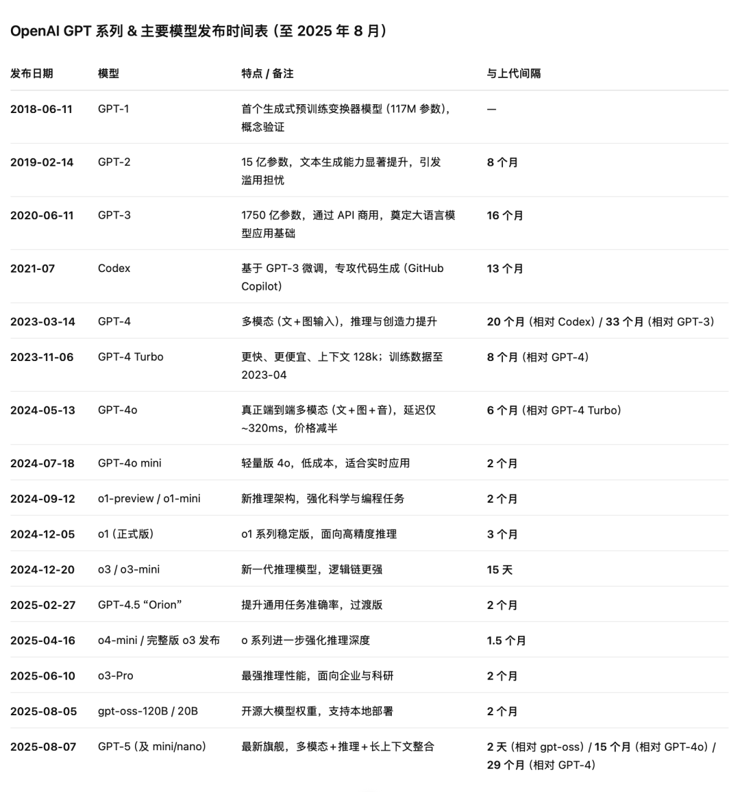 It has been 29 months from GPT-4 to GPT-5, but this time there was no leap-frog improvement like from GPT-3 to GPT-4. Over the past year, OpenAI has maintained a pace of releasing a segmented model every two months on average, filling the vacuum period between model generations with dazzling models, emphasizing the o series for reasoning, smaller mini models, and more powerful Pro versions.