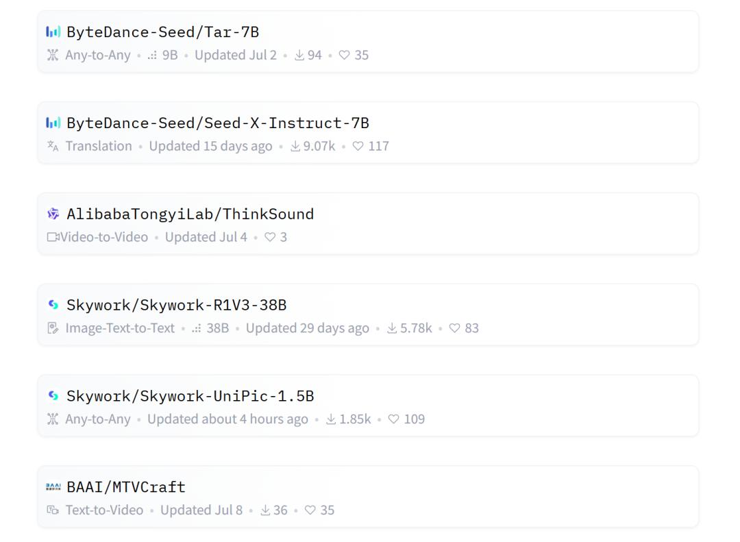 In the July rankings of the internationally renowned open-source community HuggingFace, Kunlun Tech appeared among the Chinese companies listed alongside major players and the "Five Tigers". On this list, Kunlun Tech had two models ranked in the Top 100 of overseas model citations, one of which was the 1.0 version of UniPic.