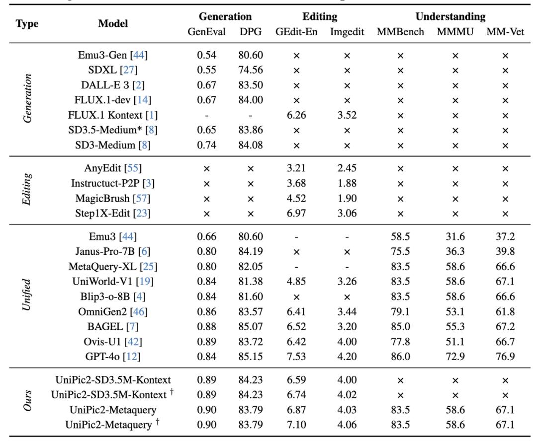 Starting with image generation, in terms of generation capabilities, UniPic 2.0's unified architecture version achieved a score of 0.90 on GenEval (testing the alignment between generated images and text), surpassing several open-source models and the closed-source GPT-4o (0.84). This demonstrates that UniPic 2.0 can maintain its high-performance edge despite its modest model size.