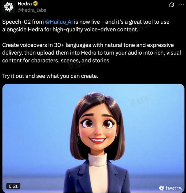 Overseas, AI voice agent platforms Vapi and Pipecat use it as their core voice engine, while leading AI applications such as Hedra, Icon, and Syllaby have also integrated MiniMax Speech, making every sentence of AI voice heard by global users more natural and precise.