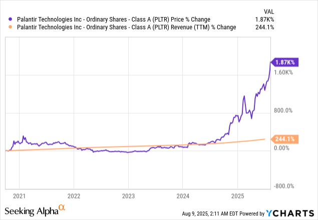 If the above data isn't enough to highlight the market's misplaced priorities, the chart below should clarify the investment logic. Over the past five years, the company's stock price has risen by 1870%, while its business revenue has only increased by 244%.