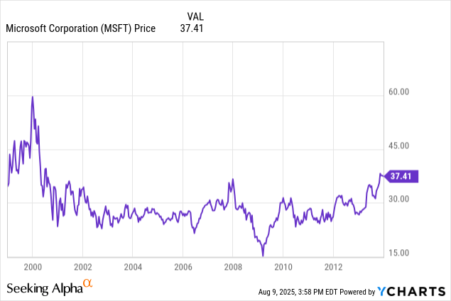 Microsoft investors who bought at the high of $60 in 2000 and held until the end of 2013 saw their investment shrink by 50% over 14 years. Worse still, during the market lows of the 2008/09 financial crisis, the decline was around 75%.