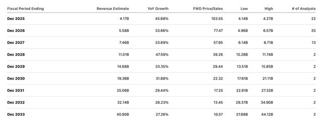 The stock's price is 12 times the revenue target for eight years from now (the chart does not include the diluted market capitalization). Even considering profits (given the company's high profit margins), Palantir's stock price is equivalent to 30 times the expected earnings per share of $6.10 in 2033.