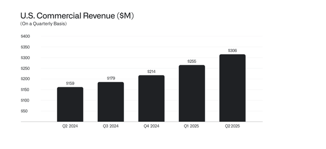 In the second quarter of 2025, revenue soared 48%, surpassing $1 billion for the first time. Notably, US commercial revenue grew by an astonishing 93%, although sales for the June quarter only reached $306 million.