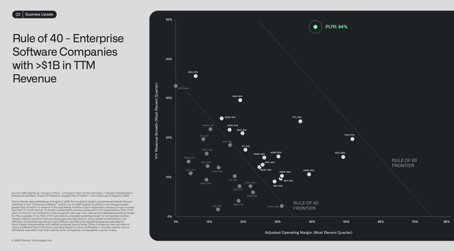 Even the calculation of the "Rule of 40" is highly exaggerated. Palantir's "Rule of 40" figure is 94%, consisting of 48% growth and 46% adjusted operating margin.