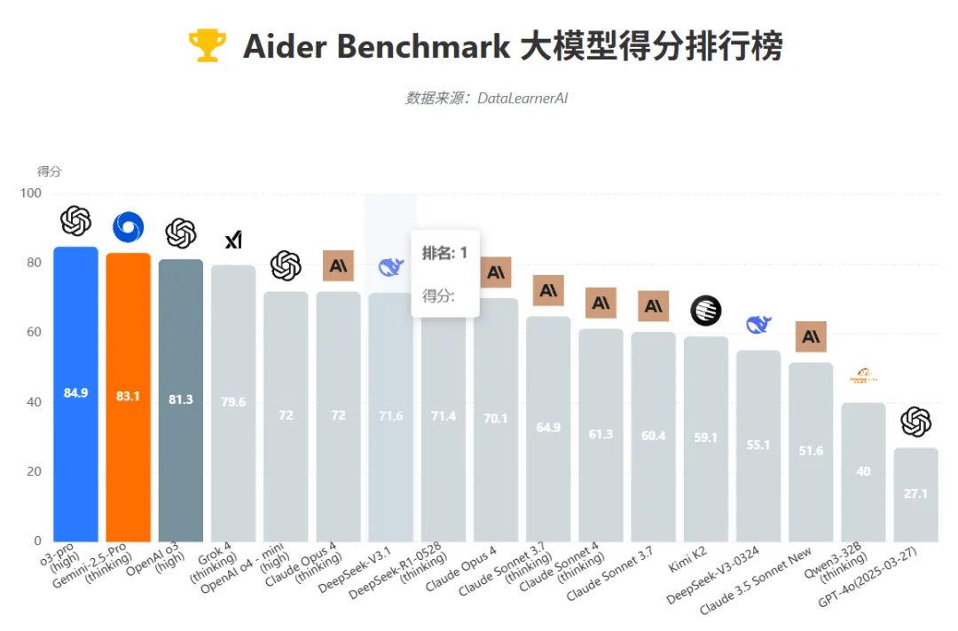 Programming prowess surpasses Claude 4 Opus: In the authoritative Aider programming benchmark test, V3.1 scored 71.6%, outperforming the previously renowned programming powerhouse Claude Opus 4, topping the open-source model rankings.