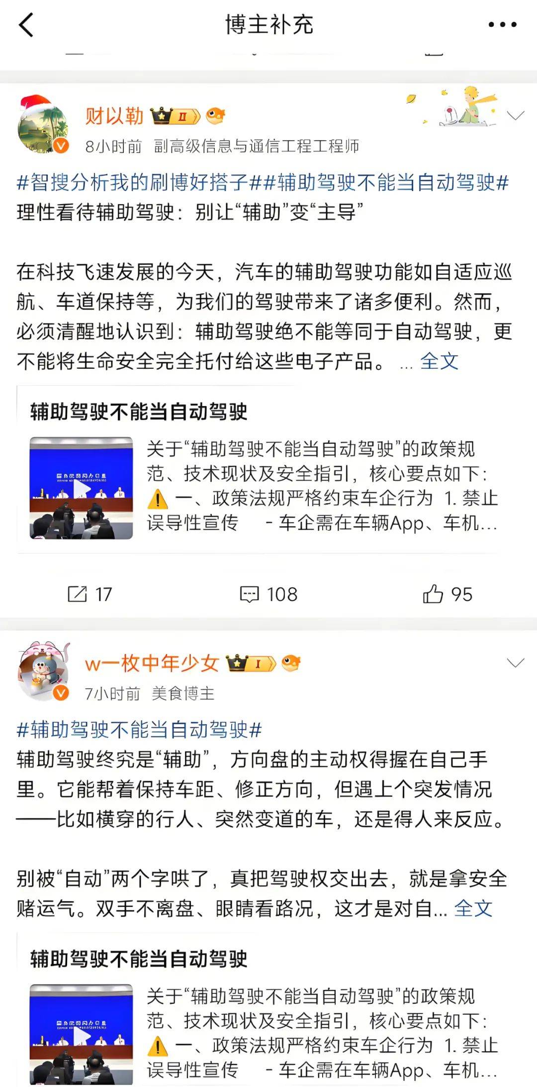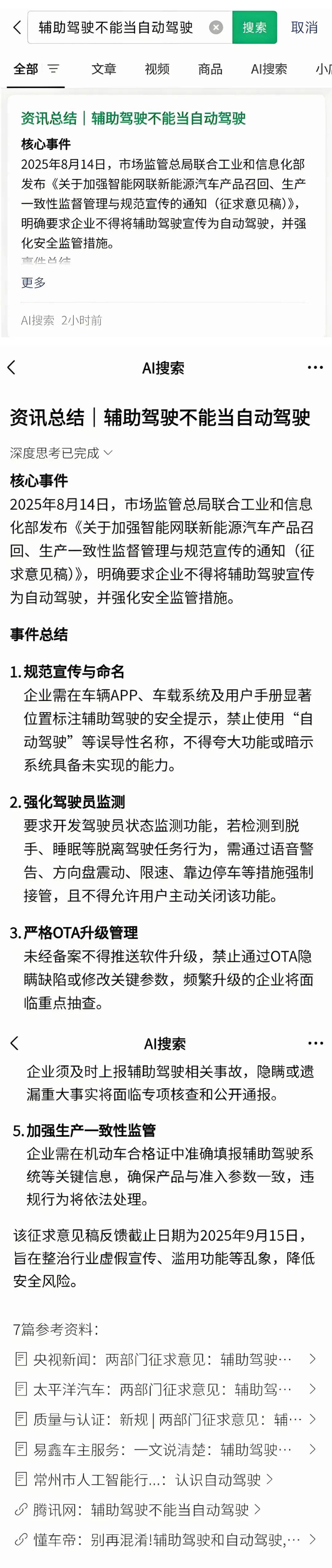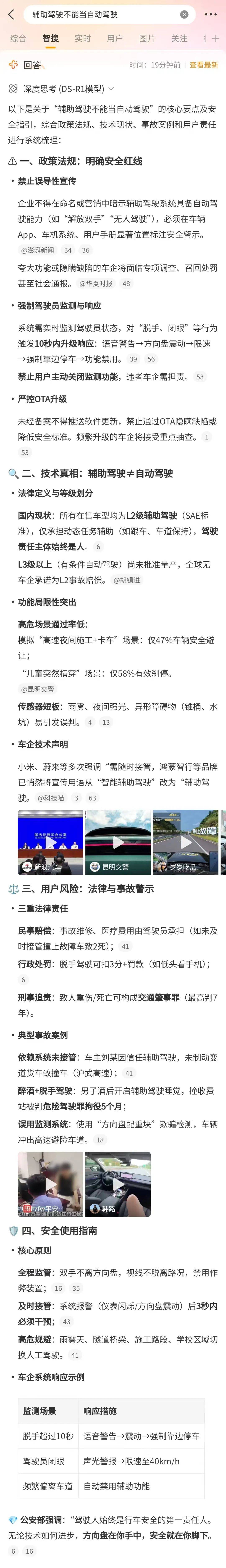 When searching for the topic "Assisted driving should not be treated as autonomous driving" as well, Weibo Smart Search provides content on policies and regulations, technical status, user risks, and safe usage guidelines. While introducing relevant policy actions, it also organizes the general status of related technical fields for readers.