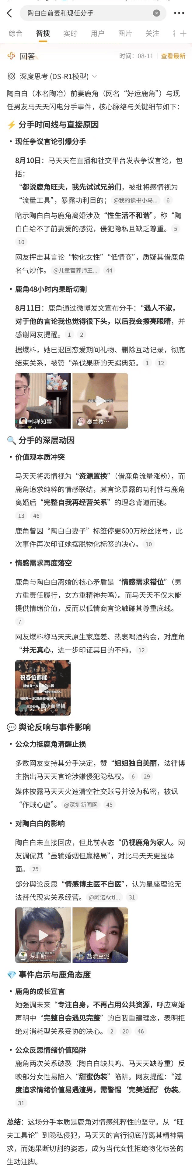 In hot gossip events, Weibo Smart Search can better demonstrate the platform's advantages of fast hot topic dissemination speed and a sound gossip ecosystem. Taking the emotional dispute of the internet celebrity blogger Taobaibai as an example, the related events are intricate and difficult for ordinary users to sort out in a short time. However, Weibo Smart Search can provide a clear timeline of each step of the event in a short time and fully present the deep motivations of the parties involved, the mainstream evaluations of netizens, and the public opinion impact of the event, achieving true one-click gossip consumption.