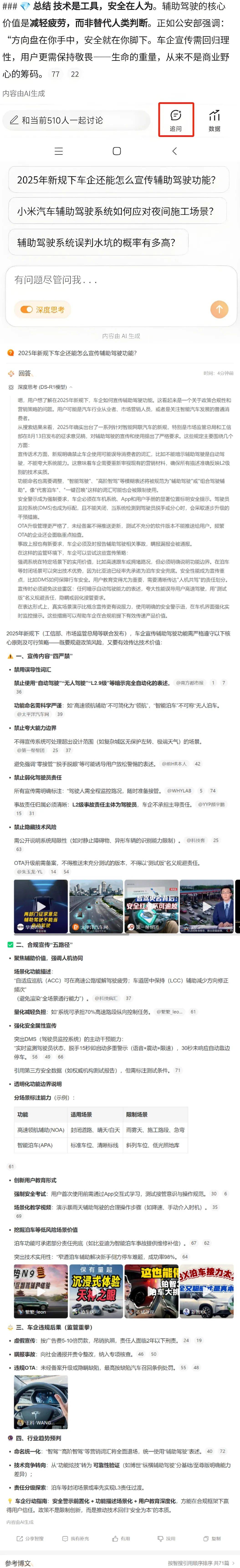 For example, under the Weibo Smart Search results for "Assisted driving should not be treated as autonomous driving," selecting "Follow-up Question" automatically retrieves recommended search questions, which can generate equally detailed answers upon selection.