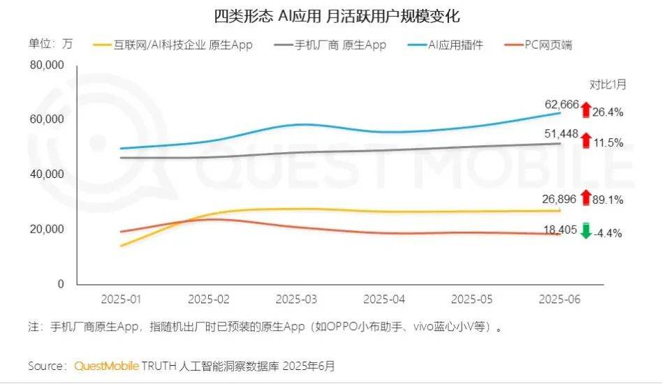 A recent report titled "AI Application Market Semi-Annual Report 2025" by QuestMobile offers a novel perspective. The report reveals that as of June 2025, the user base of mobile native AI apps stood at 570 million, whereas the larger market lies in app plugins, with the user base of mobile in-app AI plugins reaching 630 million, surpassing that of native AI apps.