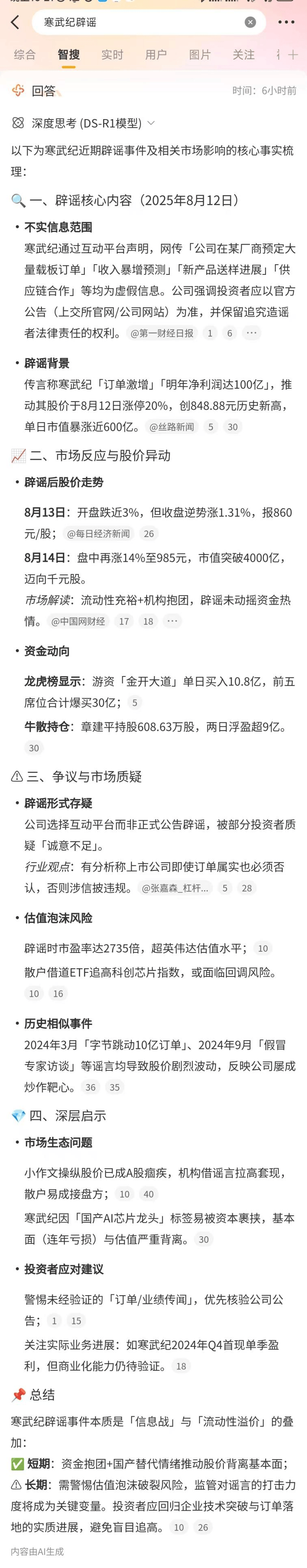 Taking the recent rumor refutation of orders by Cambricon as an example, relevant statements were quickly retweeted by media on Weibo after being released, and related content was quickly included in Weibo Smart Search, forming a complete analysis from official statements to market reactions, market doubts, and event interpretations.