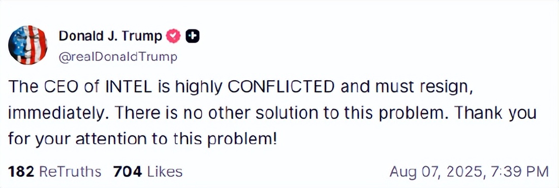 On the evening of August 7, Trump posted this tweet. The target was Pat Gelsinger, who had only been CEO of Intel for four months. The ammunition for the attack came from a letter from Republican Senator Tom Cotton, which directly pointed out that Gelsinger had past connections with multiple Chinese semiconductor companies through Walden International, which he founded.