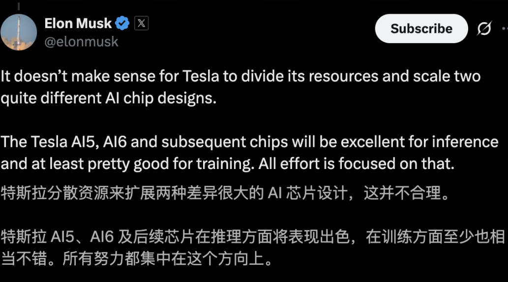 Compared to financial pressures, Musk's response to Bloomberg's report was more direct—it's unreasonable for Tesla to spread resources across two distinct chip designs.