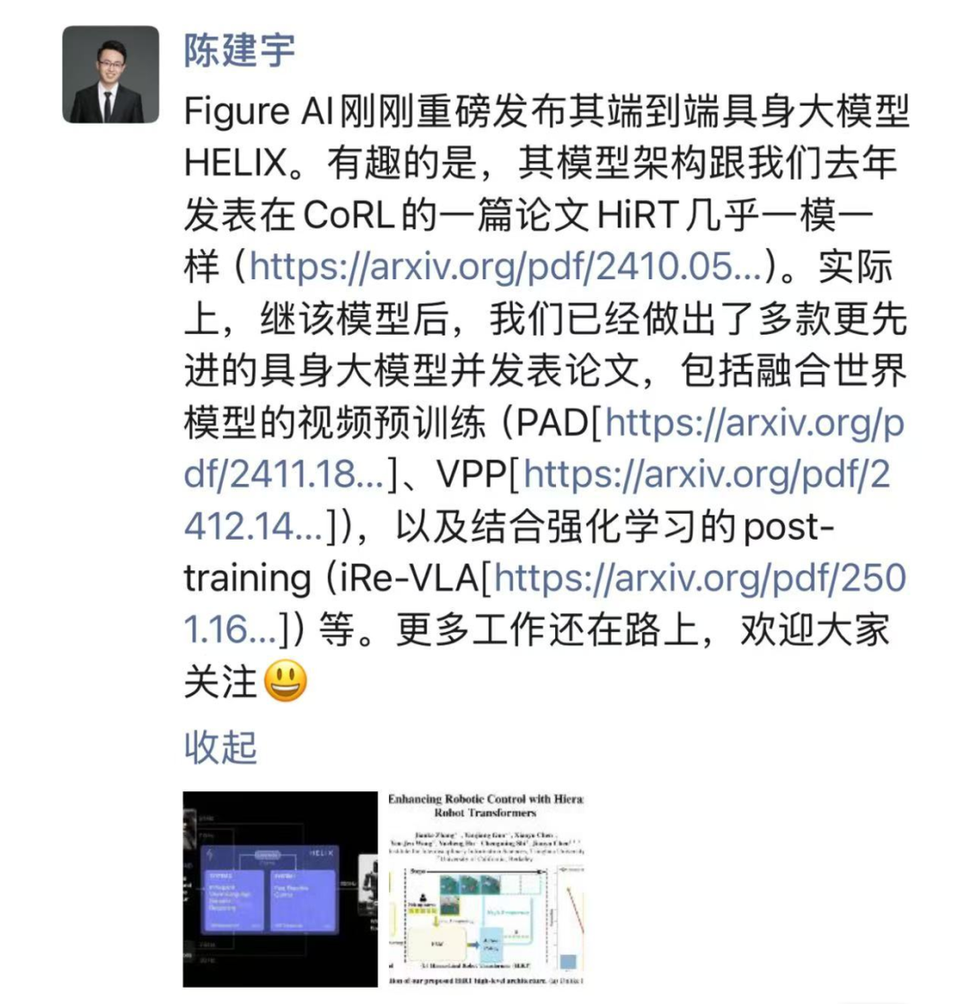 For instance, Xingdong Jiyuan applied the fast-slow system architecture of the HiRT framework (Xingdong Jiyuan founder Chen Jianyu is also one of the authors of the HiRT paper) to its self-developed end-to-end native robot large model ERA-42 in 2024. In 2025, the Helix model released by American star humanoid robot enterprise Figure AI adopted a highly similar architecture to HiRT.