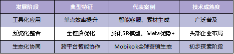 Stage 3: Ecological Collaboration. AI becomes the infrastructure of digital marketing, exemplified by Mobikok's "brand-effect-sales integration" ecosystem, which facilitates a 2.3-fold annual GMV increase for a cross-border e-commerce company through the programmatic advertising platform, Buzzify monetization platform, and trial advertising alliance's three major business matrices.
