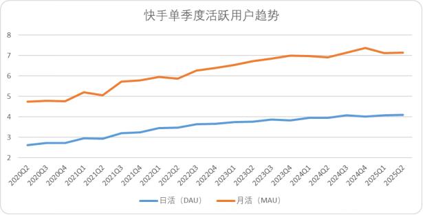 Despite the industry's general decline, Kuaishou presents a unique picture. The mid-year report reveals that in the second quarter of this year, Kuaishou's DAU and MAU reached 409 million and 715 million, respectively, with year-on-year increases of 3.4% and 3.3%. The average DAU hit a new high and exceeded 400 million for the fourth consecutive quarter. The average usage time reached 126.8 minutes, and the total user usage time increased by 7.5% year-on-year.
