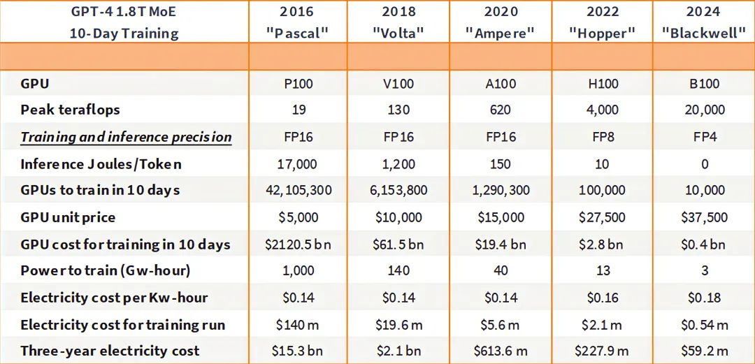 Figure: The iteration of GPUs from Pascal to Blackwell has reduced the electricity bill for training large models from over $140 million to less than $600,000.