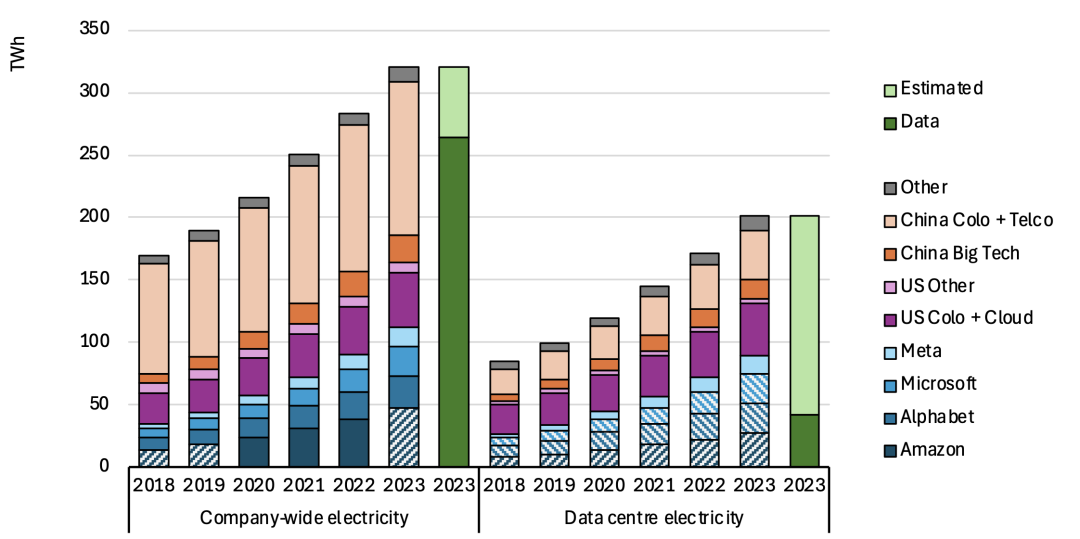 Figure: Estimated electricity consumption of large data center operators and technology companies from 2018–2023