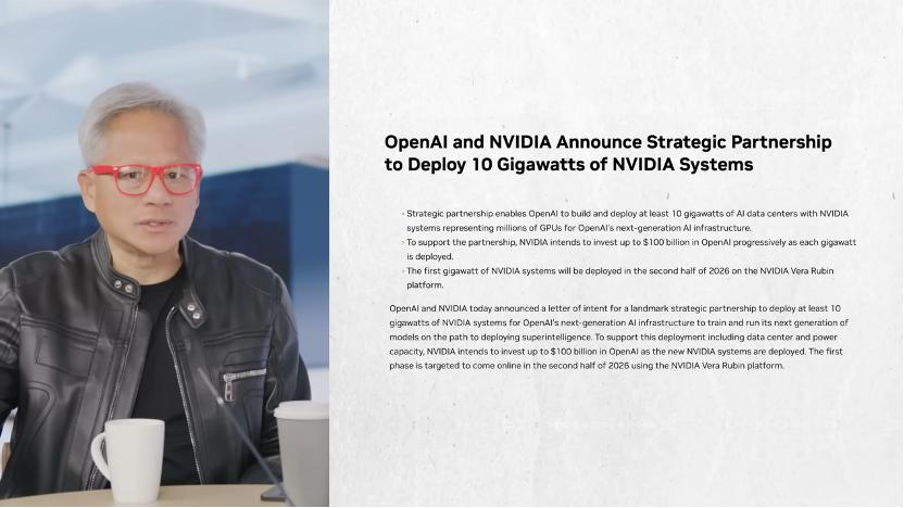 Host: This indeed brings us to the groundbreaking moment everyone's been talking about this week. A few days ago, you announced a massive deal with OpenAI's Stargate project. You'll be the priority partner and invest $100 billion in the company. Over time, they'll build AI data centers with at least 10 gigawatts of capacity, and if they use NVIDIA for data center construction, it could mean up to $400 billion in revenue for NVIDIA. So please help us understand and tell us about that partnership. What does it mean to you, and why is this investment so meaningful for NVIDIA?