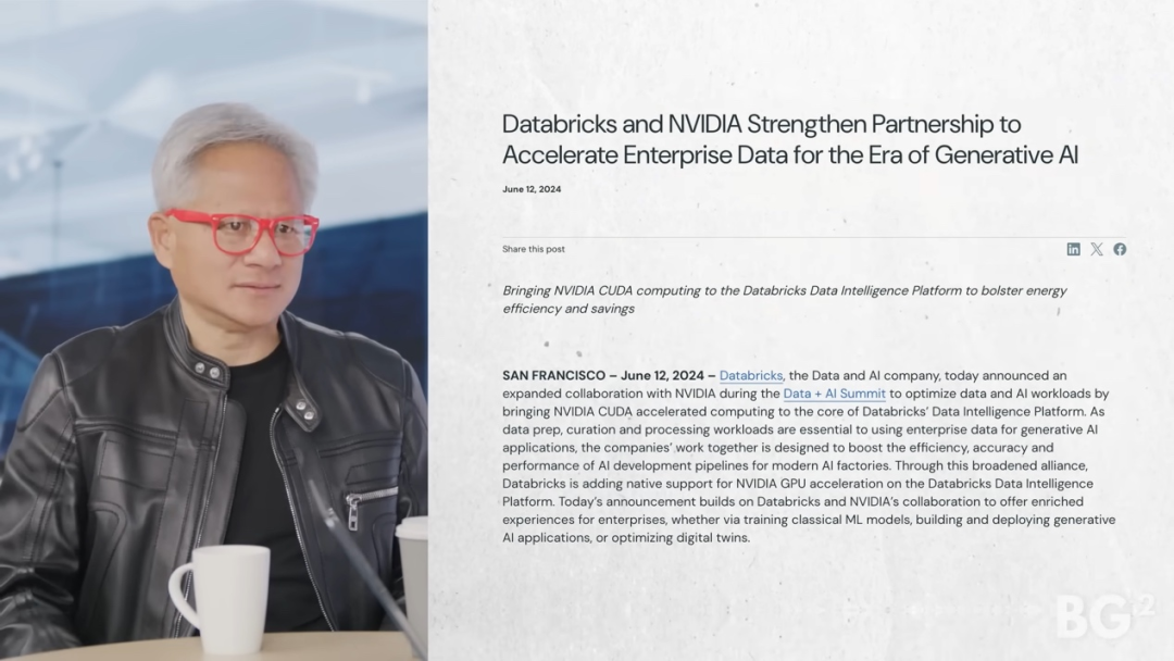 Huang Renxun: One of my favorite examples is traditional data processing—structured data and unstructured data, just old-fashioned data processing. And very soon, we will announce a large-scale accelerated data processing initiative. Data processing represents the vast majority of CPU usage in the world today, and it still runs entirely on CPUs. If you go to Databricks, most of it is CPUs; you go to Snowflake, mostly CPUs. Oracle's SQL processing, mostly CPUs. Everyone is using CPUs for this, and in the future, all of this will migrate to AI data. That's a massive market we're going to transition into. Everything NVIDIA does requires an acceleration layer, requires domain-specific data processing recipes, and we have to build it, but it's coming.