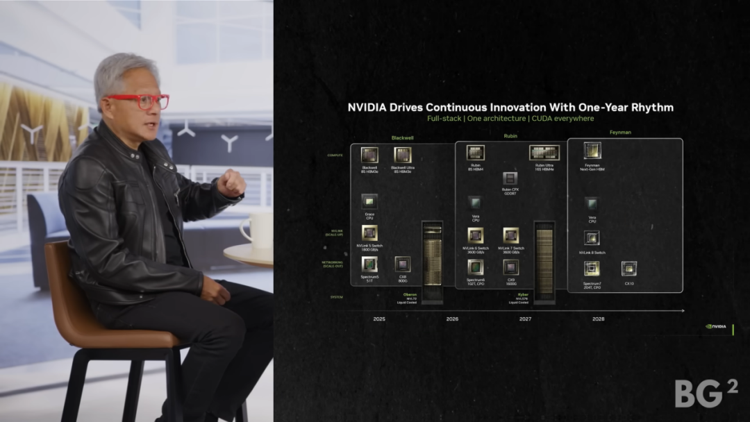Host: Let's dive deeper into system design, then. In 2024, you switched back to an annual release cycle, and then you did a massive upgrade that required a major overhaul of data centers alongside Grace Blackwell. In the second half of 2026, we'll get Vera Rubin. In 2027, Ultra will be released, and then in 2028, Feynman. How's the annual release cycle going? Is it smooth? What's the primary goal of adopting this annual release cycle? And does NVIDIA's internal AI enable you to execute this annual release cycle?