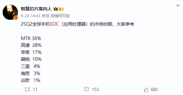 Blogger "Wisdom Chip Insider" revealed on Weibo the market share distribution of global mobile SOC (application processor) in the second quarter of 2025. The data indicates that MediaTek (MTK) maintains the lead with a 36% share, followed by Qualcomm at 28%, and Apple at 17%.
