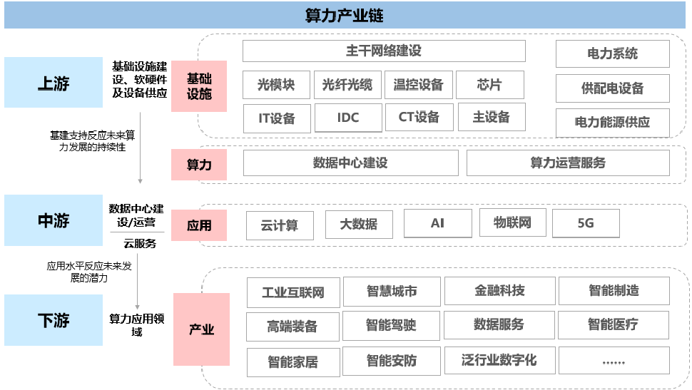The midstream encompasses computing power networks and platforms, including various data centers and operational services, cloud services, and security services based on these data centers.
