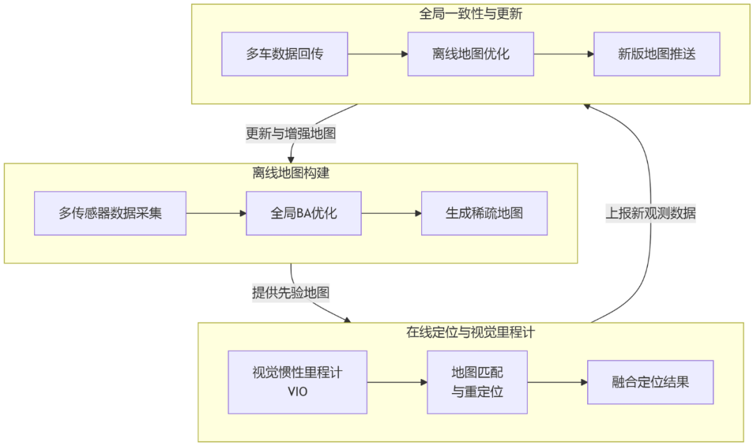 As the vehicle operates, it continuously generates new observations that may reveal defects in the map or changes in the environment. Therefore, the system needs two capabilities: first, to transmit online observations back to the offline side for fusion and map maintenance; second, to handle map version changes on the online side (e.g., receiving new map versions pushed from the cloud).