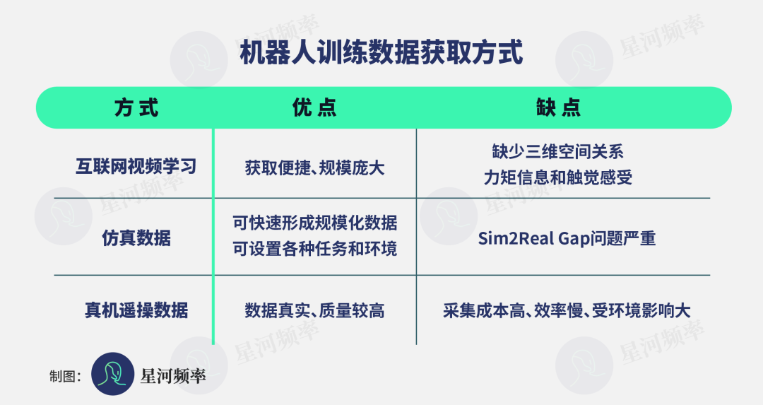 Currently, firms acquire robot training data via internet video learning, simulation-generated data, or human teleoperation, each with significant limitations. The industry now adopts a hybrid 'real + simulated data' approach.