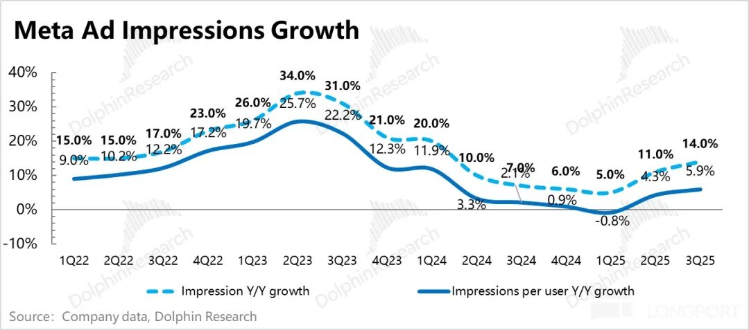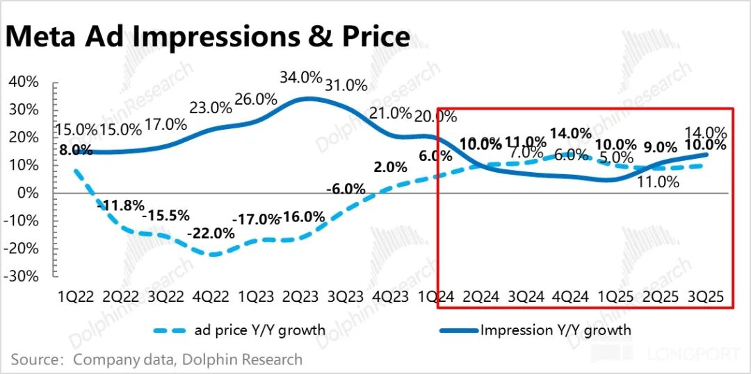 The growth in DAP (Daily Active People) + increase in ad impressions per DAP drove a 14% year-on-year increase in total impressions in the third quarter, a solid performance. Regionally, the total impressions still clearly demonstrate Meta's control over ad release as an advertising platform: