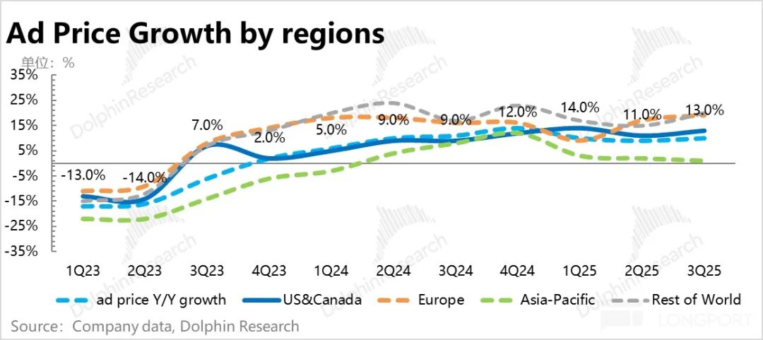 The year-on-year acceleration of comprehensive ad prices in the third quarter increased by one percentage point to 10%. Regionally, it is evident that Europe, benefiting from favorable exchange rates, saw a rapid increase in year-on-year growth to 19%, while ad prices in the United States further rose to 13%.