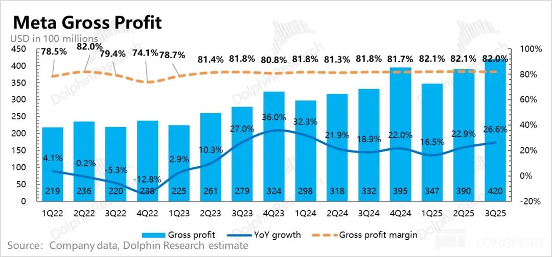 Dolphin Research believes that behind this volume and price growth, in addition to favorable macro conditions, it is essentially related to TikTok being continuously used as a bargaining tool and unable to develop normally, while Meta has used AI technology during this period to enhance user stickiness and strengthen its ecological barriers. Only with this fundamental background can Meta achieve a true "rise in both volume and price."