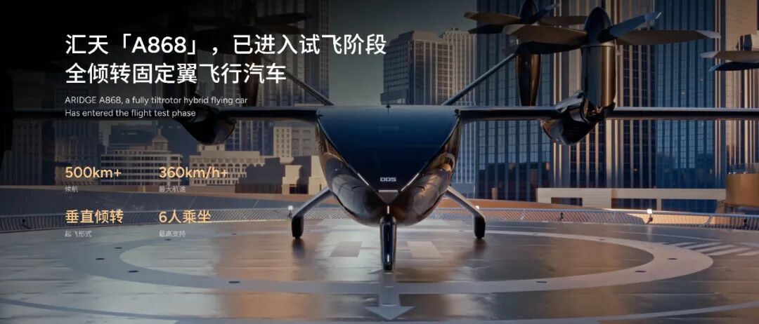 The officially unveiled 'A868' at this Tech Day adopts a full-tilt configuration, built on XPENG Motors' Kunpeng super extended-range architecture with a self-developed aviation-grade hybrid-electric core, expected to achieve a 500km range and a maximum speed of 360km/h, with a 6-seat cabin designed for business travel needs.