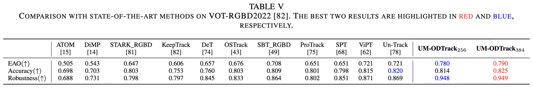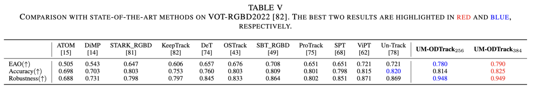 VOT-RGBD2022. VOT-RGBD2022 is a short-term tracking dataset containing 127 RGB-D video sequences. As reported in Table V below, our tracker achieved new state-of-the-art results compared to most other tracking algorithms. Specifically, our UM-ODTrack256 obtained scores of 78.0%, 81.4%, and 94.8% on the EAO, accuracy, and robustness metrics, respectively. Compared to the latest unified tracker Un-Track, our UM-ODTrack256 achieved improvements of 5.9% and 7.9% in Expected Average Overlap (EAO) and robustness score, respectively. This indicates that our unified modeling technique is more effective for general feature learning and can provide a suitable and stable feature space for each modality (i.e., depth modality).